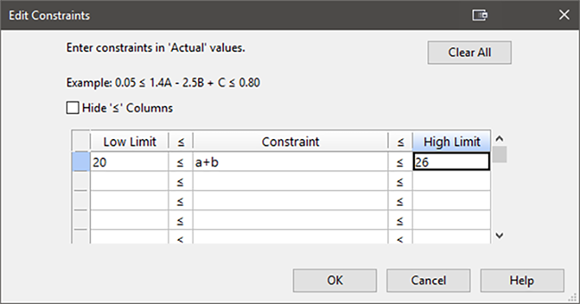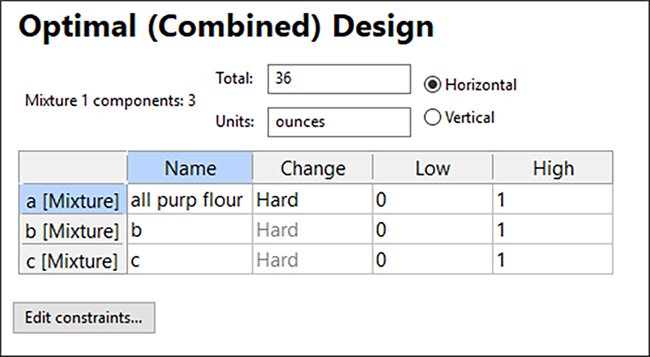 レシピの中には、大きな違いがあってはならないものがあります。それは小麦粉の総量です。十分な量の小麦粉が確実に使用されるように、ページの下部にある “Edit Constraint” ボタンをクリックして条件を追加します。小麦粉の合計は a+b で構成されるため、Constraints 列に「a+b」と入力します。小麦粉を適量に保つために Low Limit に「20」、High Limit に「26」と入力します。