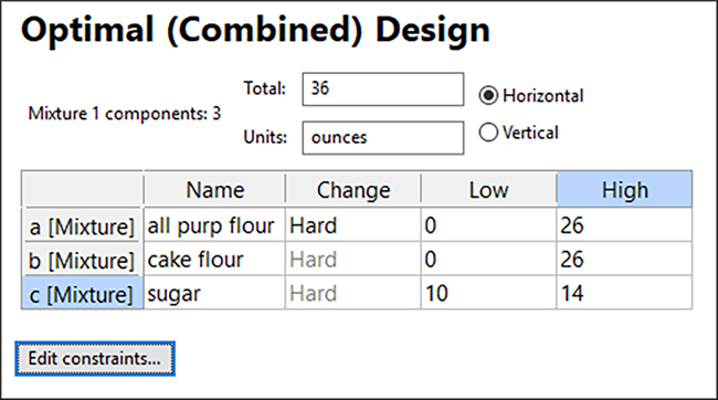 Tab キーで列を移動し、Low に「0」、High に「26」と入力します。次に、成分 B に「cake flour」と入力し、Low に「0」、High に「26」と入力します。さらに、成分 C として「sugar」と入力し、Low に「10」、High に「14」と入力します。他と関連してこれらの成分の水準が変わると、薄力粉の必要性と、最適な砂糖の水準が測定されます。計画は以下と同じようになっているはずです。