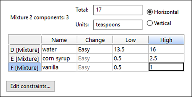 フィリングとフロスティングの合計として Total に「17」、 単位として Units に「teaspoons」と入力します。私たちはレシピのうちでも限定された (影響の大きい) 材料のみで実験しています。この混合物は ETC 因子のため、Change 列を変更する必要はありません。成分 D の Name に「water」、Low に「13.5」、High に「16」 と入力します。そして、成分 B の Name に「corn syrup」、Low に「0.5」、High に「2.5」と入力します。また、成分 C の Name に「vanilla」、Low に「0.5」、High に「1」と入力します。