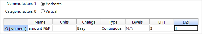 “Next” をクリックして、数値型因子に移動します。Name を「amount F&F」(filling and frosting)に変更し、Low Level をあらわす L[1] に「3」、High level をあらわす L[2] に「4」と入力します。