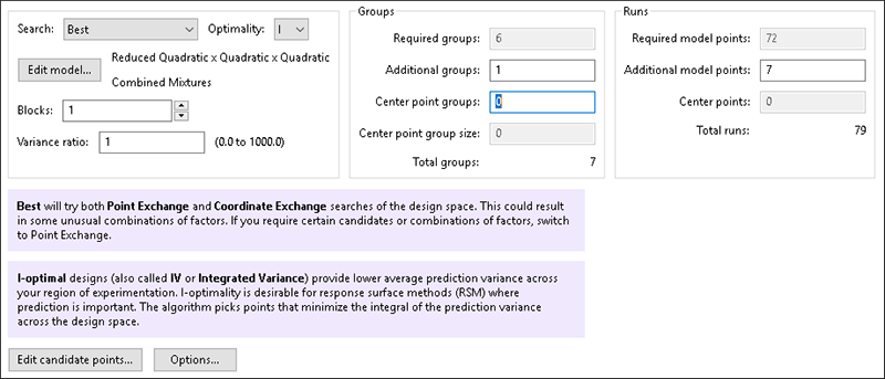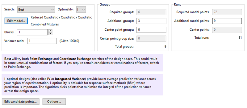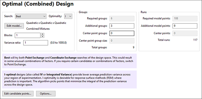 “Next” をクリックすると Design オプションが表示されます。Optimal Design には数多くのオプションの選択肢が用意されており、複合計画においてはさらに多くのオプションが存在します。“Edit Model…” ボタンのそばを見ると、“Quadratic x Quadratic x Quadratic” と表示されているのが分かります。これにより、Mix 2 モデルが Mix 1 モデルと同じ
