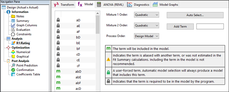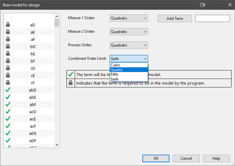 Model タブでは、Combined Model(4次項のみに減らされた)が検討のために表示されます(Process order において、項および計画モデルの隣には緑色で “