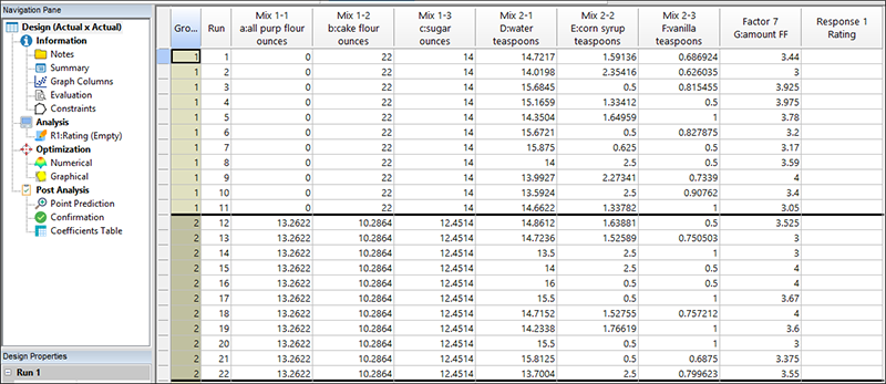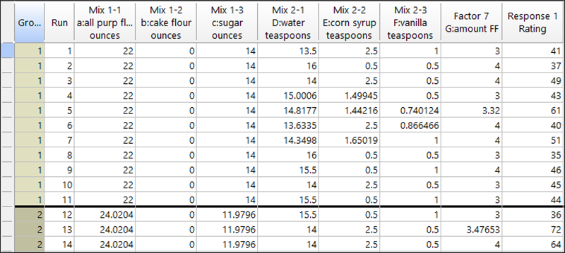 グループ間の因子水準をリセットするよう警告が表示されます。とりあえずこの警告は無視して、“OK” をクリックします。計画は無作為化されるため(制約なし)のため、画面に表示される試行は各ユーザーによって異なります。最初の2つのグループは以下のように表示されます。Group 1 においてケーキは、中力粉が0オンス、薄力粉が22オンス、および砂糖が14オンスの分量で焼きます。その後の Group 2 では、全く別の分量となっています。分割法の素晴らしい点は、同じケーキレシピの試行を連続して11回行えることです。そのため、11個のケーキをまとめてオーブンで焼くことができ、時間を大幅に節約することができます。