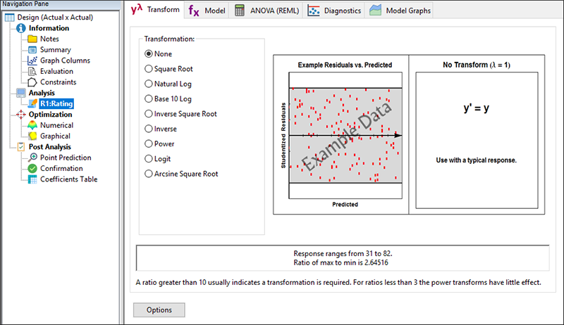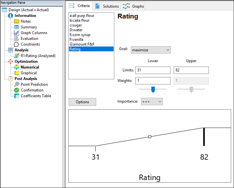この実験プログラムの最終目標は、Lady Baltimore Cake のレシピをカスタマイズして、総合評価が最高となるような方法を知ることです。配合の最適な組み合わせを探し出すために、“Numerical” とラベル付けされた最適化ノードをクリックします。次に、 “Rating” を選択します。Goal ドロップダウンリストから “maximize” を選択し、その他の全てはデフォルトのままにします。画面は次のようになります。