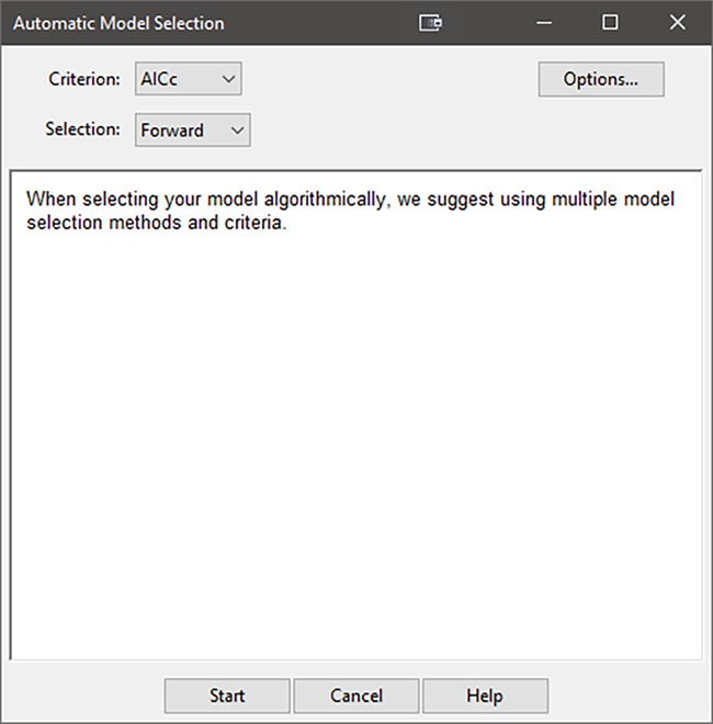 これをコンピューターで自動的に行うには、“Auto Select…” ボタンをクリックします。解析を実行するには、デフォルトのまま Criterion に AICc を、 Selection に Forward を適用し、“Start” ボタンをクリックします。計画モデルの項が検討され、AICc 基準を最も改善する項が選択されると同時に、基準の改善ができなくなるまで、それらの項がモデルに追加されます。