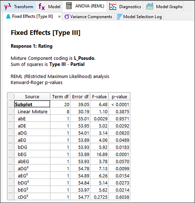 この subplot を全体としてみると、モデルには極めて有意な F 値があります(p 値<0.0001)。ほとんどの項も有意(アルファレベル 0.05)であるか、階層のために必要です。例えば、有意ではない項 ABE は、有意な ABEG 項のために必要です。