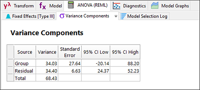 次に、“Variance Components” タブをクリックして、各種統計量が REML 解析を補足していることを確認してください。