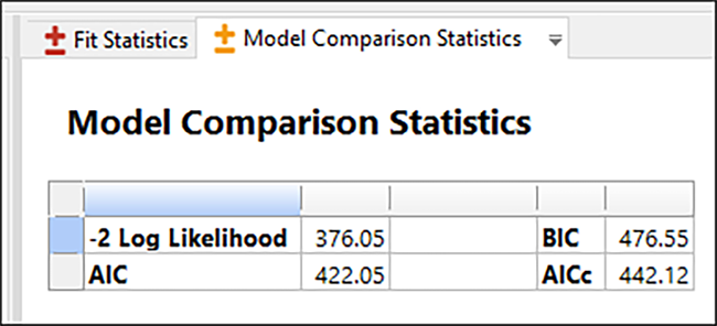 ここで、Variance Components の詳細が表示されます。“Model Comparison Statistics” タブに移動して、情報基準(AIC、BIC、AICc)を含む、選択したモデルの尤度比をさらに詳しく見ることができます。詳細についてはヘルプメニューを参照してください。