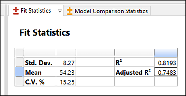 確認すべき重要な数字のひとつに、“Fit Statistics” タブにある Adjusted R2(自由度調整済み決定係数)があります。この数字は 0 から 1 までの間で推移し、1 が最も優れています。この例の場合、自由度調整済み決定係数は 0.75 です。決定係数では、選択したモデルがデータ内における変動の大部分(~75%)を捉えていることが表示されます。