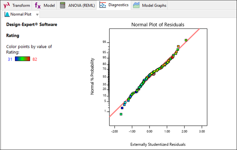 フローティングの Diagnostics ツールから見つけた残差のグラフは、重要で確認する必要があります。しかし、これらについては別のチュートリアルで詳しく説明しています。例えば『多因子における RSM』チュートリアルを参照してください。この場合、診断に問題はなさそうなので “Model Graphs” をクリックして混合(三角)空間における応答を表示します。