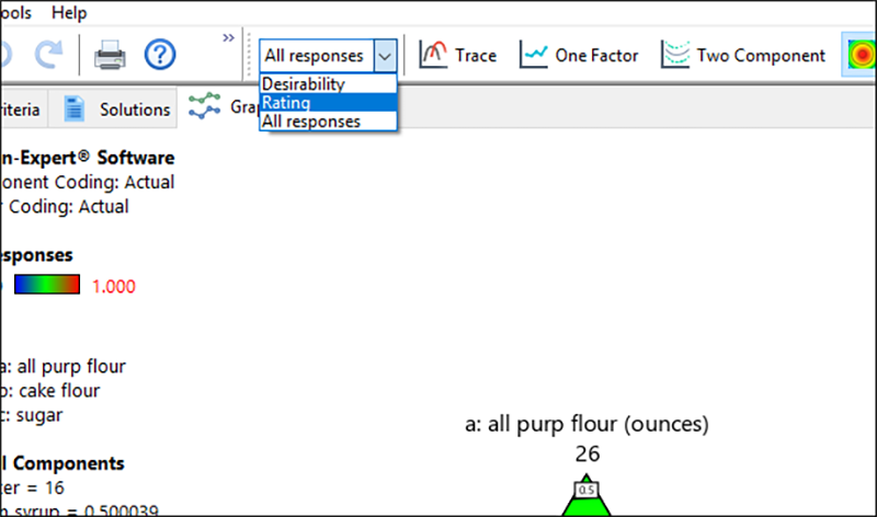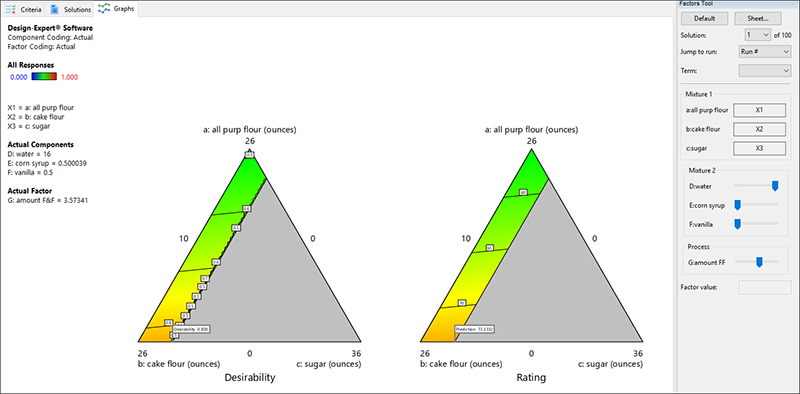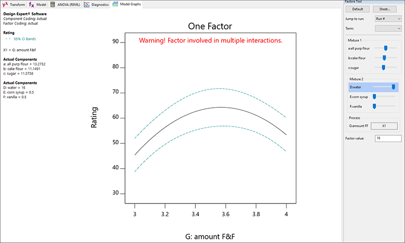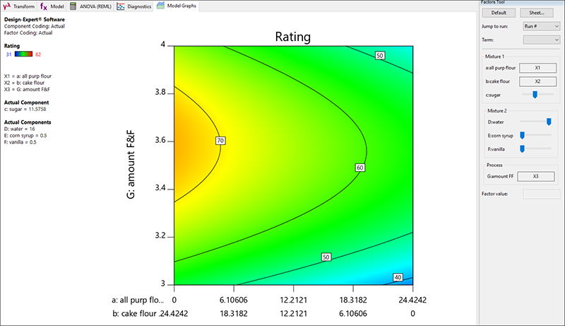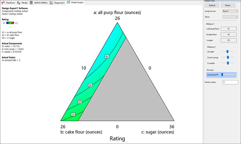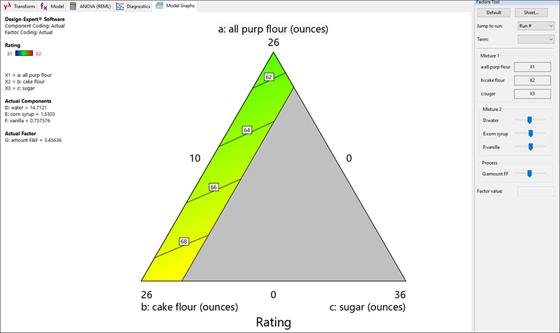 フローティングの Factors Tool に表示されるように、この混合物は Mixture 2(フロスティング)とプロセス因子(F&F の量)が相互作用することを忘れないでください。これらの因子のバーを、クリック&ドラッグすると応答グラフが変化します。例えば、Factors ツールの Process リストにある F&F を左(低い値)にドラッグしてください。フロスティングの量が減るにつれて、全体的に味が落ちるのは当然です。フロスティングがかかっていないケーキを欲しがる人がどこにいるでしょうか?