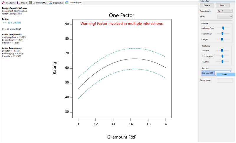これにより amount F&F が X 軸に配置されます。前のグラフで見たように、amount F&F の値を上げると味が良くなりますが、これはある程度までです。量が最高水準になると、味の評価は下がります。グラフの上部に赤く示された警告で気づくかも知れませんが、これは手順全体の一部でしかありません。amount F&F は2つの混合物と相互に作用します。フロスティングの混合物がどのようにグラフに影響を与えるかを確認するために、Floating Factors ツールからMixture 2 の赤いバーをドラッグします。例えば、water の水準を高水準にドラッグし、F&F グラフがどのように対応するかを確認してみてください。