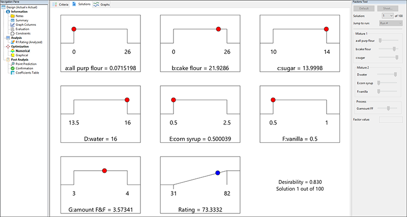最適解におけるグラフを検証するには、“Graphs” タブをクリックします(Solutions バーの solution 番号は必ず 1 を選択してください)。最適解にはフラグが立てられています(中力粉が低水準の地点)。デフォルトではすべての応答が並んで表示され、そこには最適解の検索に使用された望ましさのプロットも含まれています。