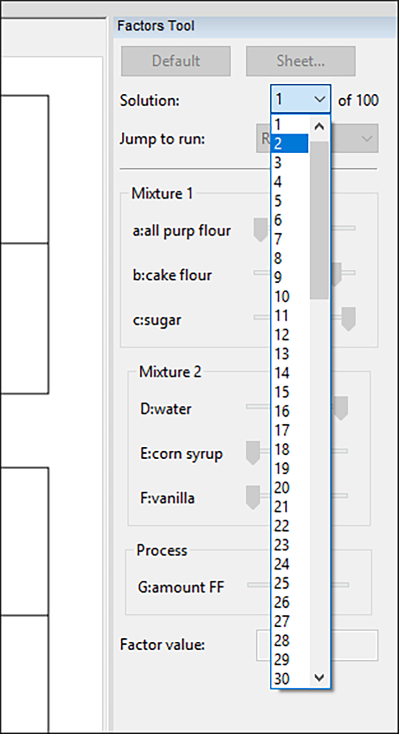 これが解の番号 1 であり、最高の評価を得ています。その他いくつかのオプションを検証するために、Factors Tool のドロップダウンメニューから別の solutions 番号をクリックしてみてください。