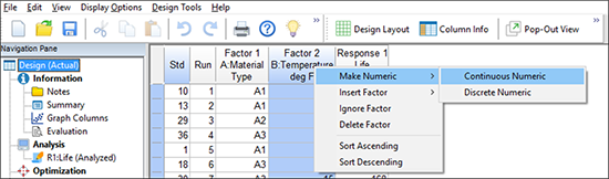まず、因子列 B:Temperature のヘッダにカーソルを移動してください。その位置で右クリックして、“Make Numeric” から “Continuous Numeric” を選択してください(この事例では、Discrete Numeric(離散数値型)を選択しても機能します。Discrete Numeric は数値型因子のうち、水準設定を便宜的に固定する必要があるものに適した選択肢です。たとえば、15、70、125 の三段階しか設定できないバッテリー用試験槽を使用するような場合はこれにあたります)。