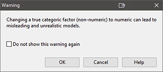 選択した因子が実際にカテゴリー型でない場合は、これを実行しないようポップアップで警告が表示されます。内容を確認して、メッセージの下にある “OK” ボタンをクリックすると次に進みます。