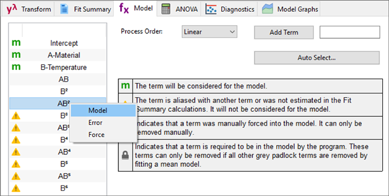データを再分析するには、まず Analysis ノードに分類された “Life” をクリックします。続いて “Model” タブをクリックします。Design‐Expert では、因子を数値型に指定した時点で、応答曲面法などで利用される多項式フィッティングに自動的に切り替わっています。気温(因子 B)関数の応答が非線形になるようモデル化します。AB2 項をダブルクリックしてください。右クリックして、以下のように Model に追加しても同じです(曲線を2乗項でとらえます)。