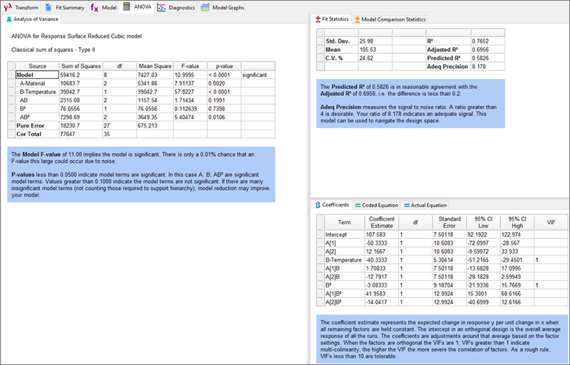 前回使用した ANOVA レポートが(注釈付き又は注釈なしで)今回も表示されます。この結果を、パート1で実行した ANOVA と比較してみましょう。モデルと残差の行において結果は同じですが、因子 B を含む項の値は前回と異なっていることがわかります。パート1では、因子 B(気温)をカテゴリー型で処理しました。もちろんこれは通常のやり方です。今回は、この同じ因子をあえて数値型として認識させましたので、B の効果だったものが今度は、B と B2 としてモデルの2つの項に分離しています。また、AB だったものは AB と AB2 に分かれ、それらは元の和になっています。