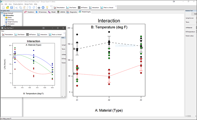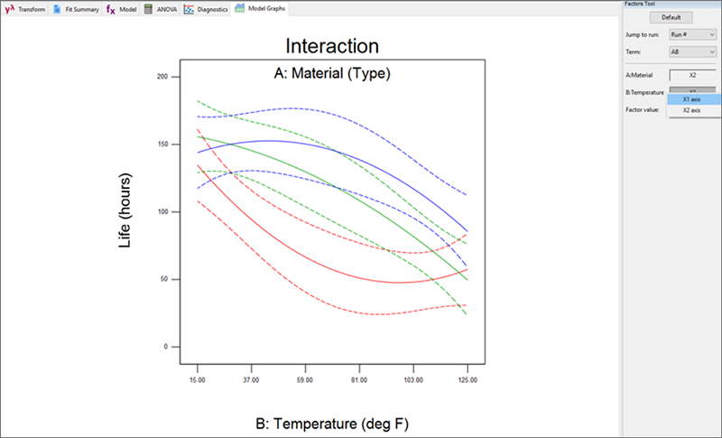 これらの機能を使用することで、結果を解釈しやすくなるだけでなく、処理するデータの種類に効果グラフをより適合させることができます。(我々はすでに、Montgomery による古典的バッテリー実験の処理にあたり、Design‐Expert® ソフトウェアの Response Surface(応答曲面)タブを使用して、気温に関する単一因子と、素材タイプに関する3水準のカテゴリー型単一因子を組み合わせて、計画を構成できることを述べました。