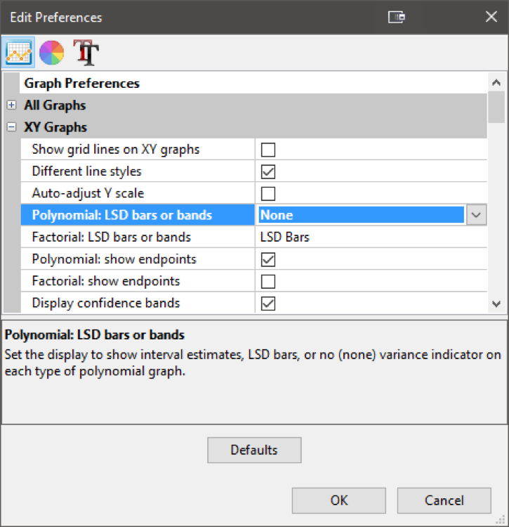 破線は信頼区間です。これらはフィッティングの不確実性を伝えるものですが、これがあることによって混乱を招くようでしたら、Graph Preferences でいつでも非表示にすることができます。まずは、グラフ上でマウスを右クリックし “Graph Preferences” を選択します。そして “XY Graphs” タブをクリックし、以下に示すように Polynomial: LSD bars or bands セクションで “None” を選択します。