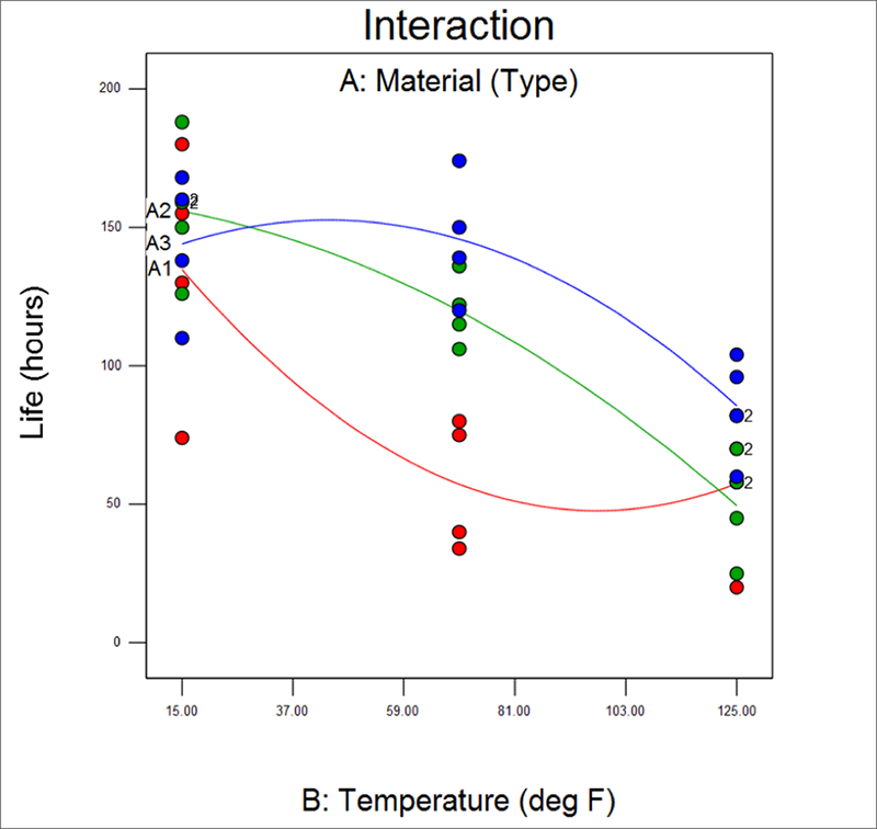 ここでパート1のデータを特徴付けるプロットが表示されました。パート1では上記のラインが別々の区分(カテゴリー)に分けて表示されていましたが、今回は連続的な温度になっているのがわかります。温度の連続的変化に基づく曲線(B によるモデリング)は、素材(A)の違いで異なる点に注目してください。このプロットでは、モデルの AB2 項の有意性を視覚的に把握できます。