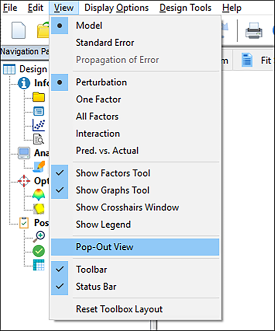 Design‐Expert の作業を終えるまえに、 “View” メニューに移動し “Pop out View” を選択します。