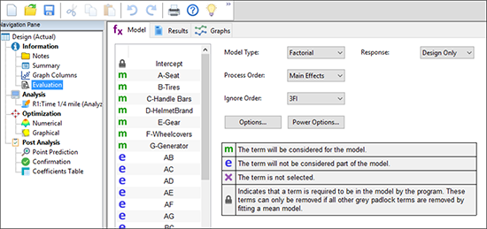 データ入力の時間を節約しましょう。“Help” -> “Tutorial Data” -> “Biker” をクリックして、実験結果を読み込みます。データを一通り眺めたら、左側にある “Evaluation” ノードをクリックして、計画のエイリアス構造を点検してください。試行数の少ないこの計画では、 Design‐Expert は主効果の順序に対する応答しかモデル化できないと判断している点に注意してください。プログラムは 3FI 以上の項は無視する設定がなされているので、2因子交互作用(2FI)までのエイリアス化を表す結果が生成されることになります。