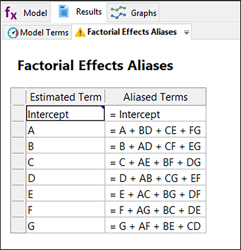 以下の評価結果を見てすぐにお分かりいただけるように、これは主効果のすべてが2因子交互作用と交絡する分解能 III 計画のひとつです(分解能が低い計画であるという注意をユーザーに喚起するため、Design‐Expert の計画ビルダーでこれらは赤のフラグで表示されます)。