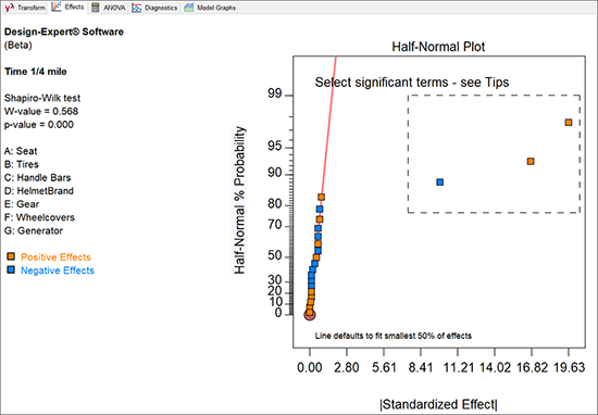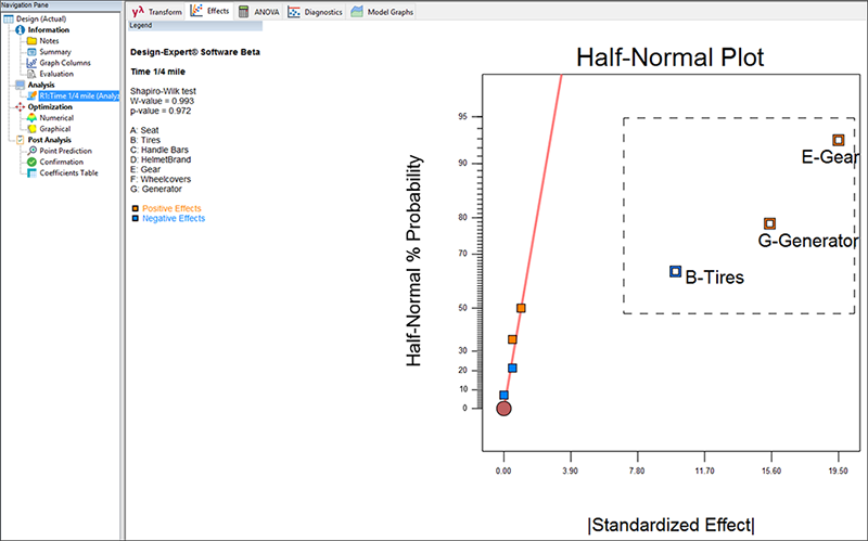 この事例でランスは、Design‐Expert ソフトウェアから提示された折り重ね技術を使用して、飽和した計画を注意深く拡張させることで、彼が着手した7つの因子から有意な因子を素早く見つけ出し、それらの交互作用を突き止めました。最終的に彼が実施した実験は、3つのブロックに分解される合計24回の試行で済みました。本来であれば、すべての主効果と2因子交互作用が他の主効果や2因子交互作用から制約を受けない分解能 V 計画によるアプローチで分析に着手すべきだったでしょうが、MR5 計画(これは Stat-Ease 社によってのみ提供されます!)を用いたこのアプローチでは、実験を少なくとも 30回は行わなければなりません。古典的な2水準一部実施計画(27‐1)を普通に使ったとしたら、これよりも更に多い64回の試行が必要です。そして、忘れないでいただきたいのは、ランス・レッグストロングが実際に8回走行して得た最初の実験結果がなければ、新春自転車競技大会で現に優勝することもできなかっただろうということです。