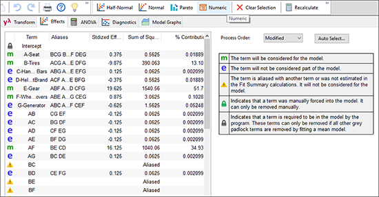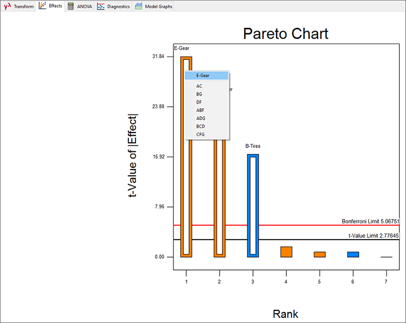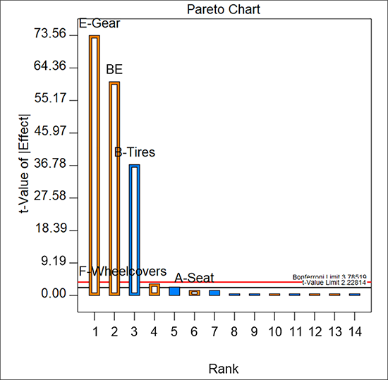 現在、交互作用 AF は BE に置き換わっています。2つの主効果 A, F が有意でないことはグラフから明らかですので、“F”(ランク4位)と “A”(6位)のラベルの付いたバーをクリックして、痕跡物としての価値しかないこれら二つのモデル項を無効にしてください。効果 B、E、BE をひとつのファミリーとして簡素化するこのやり方に注目してください。つまり、このモデルは各々が独立して有意となるすべての項で、階層構造を成立させたと言えます。原則として、簡素化モデル(統計学的に言えば「parsimonious:節約」)は、それよりも多数の項を必要とするものに支えられるべきものです。特にこのことは、前に作成した親因子のない AF を使った例のように、それ自身では有意でない親の項をもつモデルに関しても当てはまります。