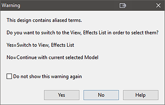 もう一度 “ANOVA” ボタンをクリックして先に進めます。今度は、“This design contains aliased terms. Do you want to switch to the View, Alias list…?”(この計画にはエイリアス項が含まれています。Alias list に表示を切り替えますか?)と警告が表示されます。“No” をクリックして次に進めてください(この Alias List には、後から戻ることができますので、ここでは心配しないでください)。