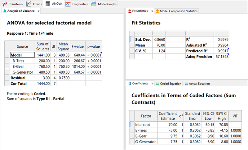 ランスは、実験データをうまく当てはめることができました。因子 B の係数が負の値であることから、タイヤの固さが固いほどトラックの走行にかかる時間は落ちるようです。また他方で、因子 E と G の係数が正の値を示していることから、ギアを高くし、発電機をオフにしておいた方が、速度が出ることがわかります。一見したところ、このアプローチは全体として非常に科学的で決定的であるかのように見えます。実際、ランスはこの実験結果に基づいて自転車を最終調整した結果、レースに出場して優勝したのですから!