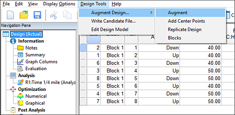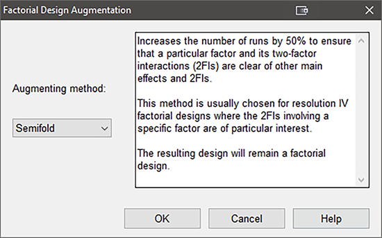 試行をさらに追加作成するには、Design‐Expert の “Design” ノードに戻り、メニューから “Design Tools” -> “Augment Design” -> “Augment” を選択します。今度は “Semifold” を実行するようプログラムに忠告が表示されます。