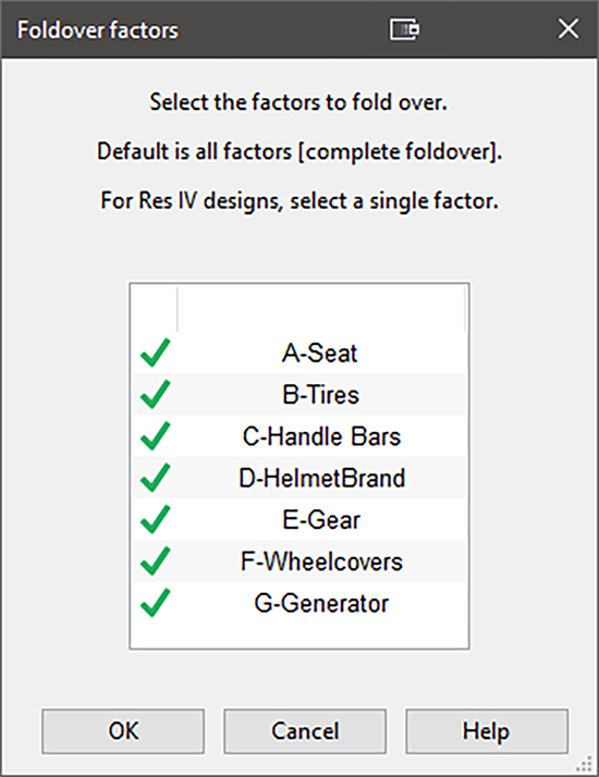 Design‐Expert のデフォルトで提示される増補オプション Foldover はこれで良いので、“OK” をクリックして進んでください。次に、どの因子を折り重ねに採用するかのリストがプログラムに表示されます。Design‐Expert デフォルトは、すべての因子が選択されるよう設定されています。これは完全な折り重ねを表します。因子の選択は、因子を右クリックするか、因子をダブルクリックすることで指定または解除することができます。