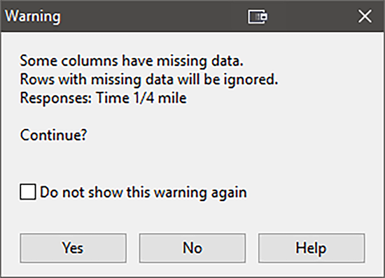 空の応答フィールドに上記と同じタイムを入力してください。入力したら、すべて正しく入力されているか、再度内容を確認してください。確認が済んだら、Analysis の “Time 1/4 Mile” ノードに移動して、“Effects” ボタンをクリックしてください。この計画が直交(orthogonal)でないことを警告する以下のダイアログが表示されます(前に少し説明したものです)。