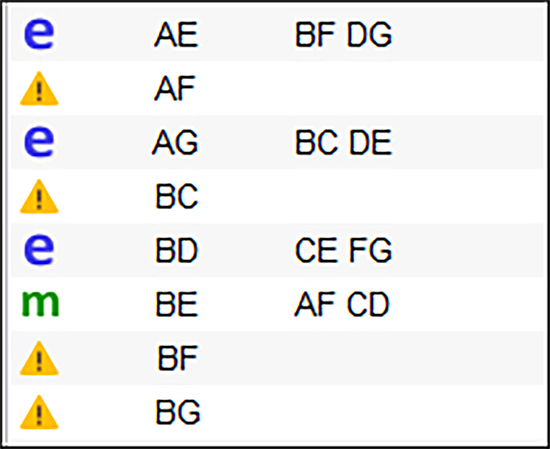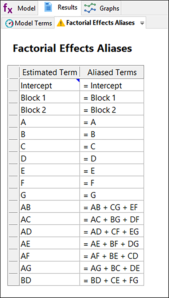 ダイアログの “OK” をクリックして、計画評価への移行を了解する “Yes” をクリックしてください。欠損データに関する警告が表示されたら、もう一回 “Yes” をクリックします。現在、Evaluation の開始画面が表示されているはずです。“Results” をクリックして、新たに追加されたエイリアス構造を確認してください。画面を下にスクロールさせて、2FI を表示し、BE が今度は3因子交互作用のみでエイリアス化されていることに注意を払ってください。