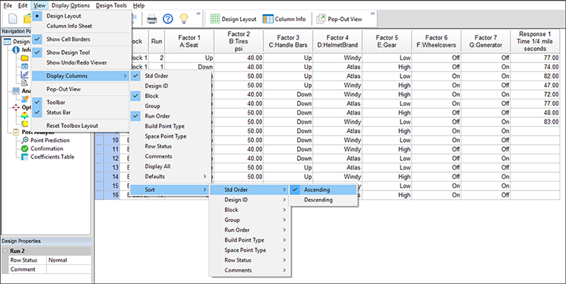 メインの “Design” をクリックして、増補された試行を確認してください。Std 列のヘッダーをダブルクリックして、その並びを標準の順序に戻します。