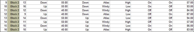 それでは、メインの Design ノードに戻って、メニューから “View” -> “Display Columns” -> “Sort” -> “Std Order” -> “Ascending” を選択してください(Tip: 任意の列をソートするには、そのヘッダーを右クリックすると簡単に実行できます)。ブロック2の各試行が、ブロック1と試行と比べてどのように反転しているかをよくご覧ください。例えば、ブロック1の Seat(因子1)は Up, Down, … と続いたのに対して、ブロック2では、down, up, … と続いています。すべてが逆に並んでいます。
