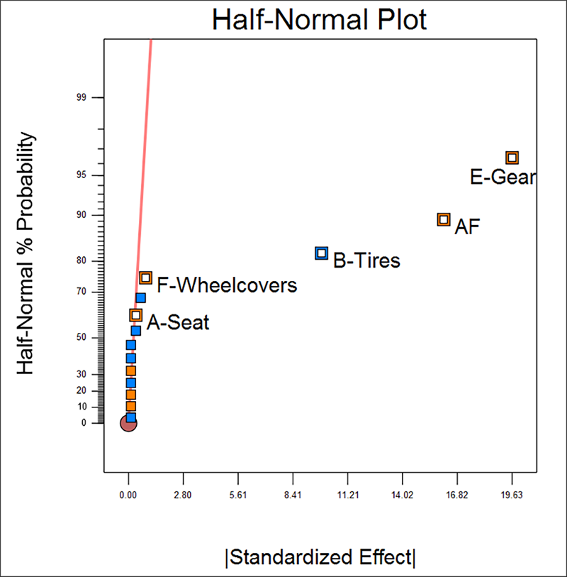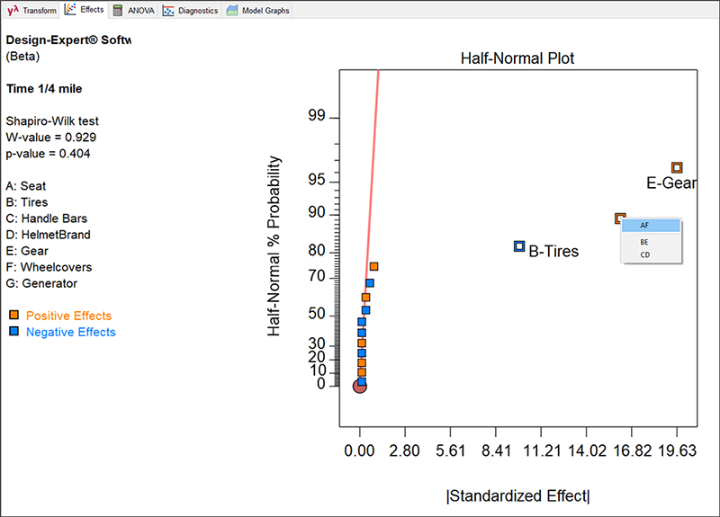 効果 G であると見なしていたものが、今回は AF としてプロットに表示されています。しかし、注意してこの計画の評価を思い出してください。この折り重ね計画においては、AF は BE と CD と共にエイリアス化されています(このことを確認するには、前に戻ってスクリーンショットを見直すか、画面上の Evaluation を押して Report をご覧ください。あるいは、こちらの方がよりお勧めの方法ですが、半正規プロット上にある AF を上図に示すように右クリックしてみてください)。Design‐Expert では、AF のみが選択されていますが、これは、すべてのエイリアス項のうちアルファベット順でもっとも上にくるものだけが表示されるようになっているからです。