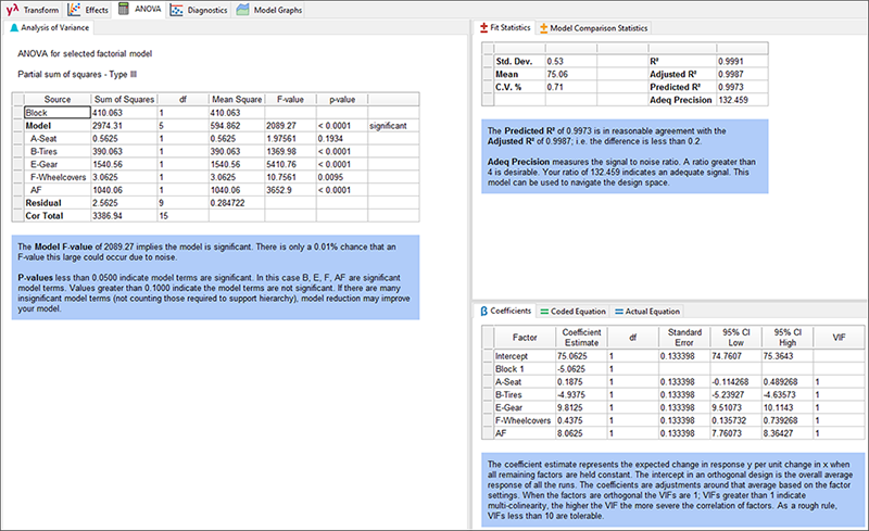 ランスとシェリルは、自分たちの主題に関する経験的知識から、シート位置とホイールカバーとの交互作用 AF は現実には起こり得ないことを知っています。また、ハンドルバーの位置とヘルメットメーカーとの交互作用 CD も存在しないはずです。彼らは、タイヤの空気圧とギアとの交互作用 BE のみが現実的に起こり得る交互作用であることを確信します。とはいうものの、デフォルトで AF の2因子交互作用を持つこのモデルの ANOVA を調べてみることにしましょう。