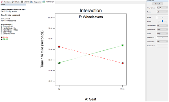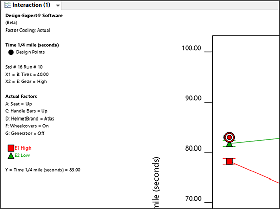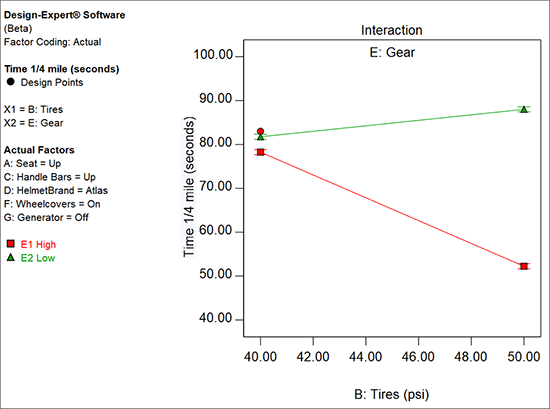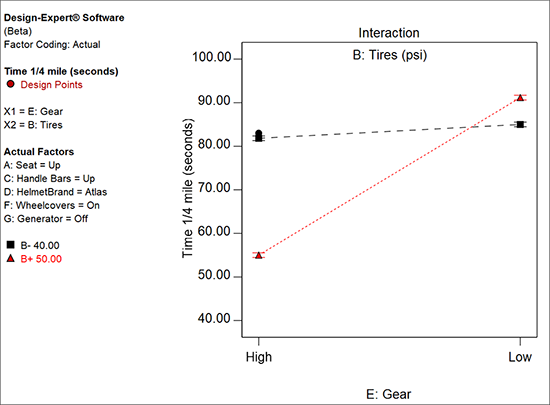 もう一度 “ANOVA” をクリックして内容を確認したら、“Diagnostics” に移動してすべてのグラフを調べてください。次に、 “Model Graphs” をクリックします。交互作用 BE のプロットの見た目は前回と同様です。実際に確認してみてください。次に、少し視点を変えて物事を見ることにしましょう。Factors Tool の “E: Gear” を右クリックして、これを “X1 axis” に指定してください。BE ではなく EB のプロットが表示されるはずです。別の言葉で言い換えれば、軸が反転したということです。グラフの直線が点線になっている点に注目してください。Gear がカテゴリ型因子(High または Low)であることをこれであらわしているのです。前の BE プロットにおいては、B(タイヤ圧)が高低両極の間の任意の水準に適合できる数値型因子であったため、その直線は実線であらわされていました。