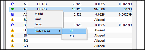 それでは、データウィンドウの上部にある “Results” ボタンを押してから、“Aliases”タブを選択して、この事例における分解能 III 計画の試行のみに関する影響が表示されます。