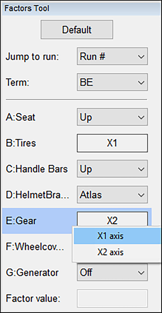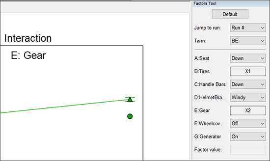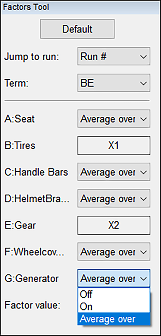 結果を高低両水準の平均値として表示させたい場合は、Factors Tool のリスト矢印をクリックして、以下のように “Average” を選択してください(因子 A:Seat、C:Handle Bars、D:Helmet Brand、F:Wheelcovers、G:Generator については既に設定済みです)。