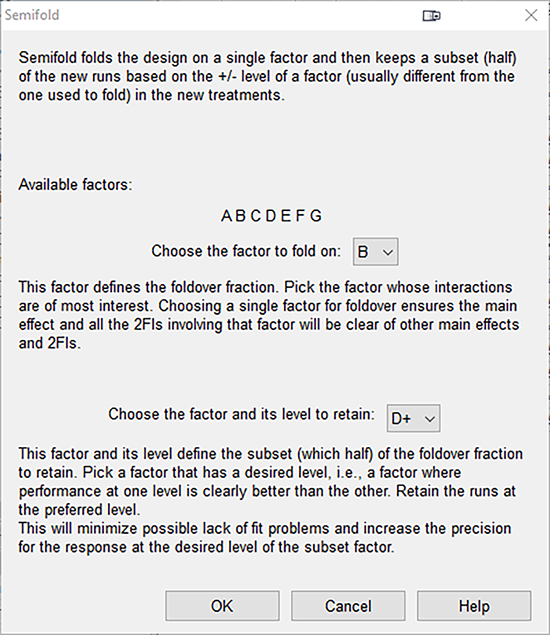 “OK” を押すと、これからランスが走ることになる第3ブロックの試行として、どの試行を追加するかを定義するダイアログボックスが表示されます。Choose the factor to fold on フィールドに “B” を指定してください。ランスとシェリルは、次の質問「Choose the factor and its level to retain」に少し頭を悩ませますが、直ちに “D+” 、すなわち、ヘルメットメーカー Windy を選択します。この因子は間違いなく応答に影響を及ぼさないと判断したからです(また、シェリルはこのブランドのヘルメットをランスがかぶっているのを見るのが好きなのです!)。