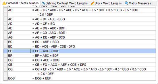 表示された計画は全体の 1/16 番目です。従って、以降の効果もそれぞれ他の 15 の効果でエイリアス化されることになりますが、その殆どは画面を不必要に占有してしまうため、デフォルトでは無視するよう設定されています。この出力結果は、いずれの主効果も3つの2因子交互作用と交絡することを表しています。