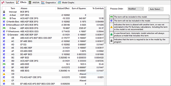 ランスは、すべての成分を一通り見渡すために、C(ハンドルバー)と D(ヘルメットメーカー)が互いに作用しあうとは思えないのですが、交互作用 AF の二番目のエイリアス:CD の効果も調べることにしました。交互作用プロットで得られた結果は全く違ったものでした。意外な結果です!もしお時間があれば、実際に確認してみてください。“Effects” ボタンに戻って、“Alias List” を選択したら、右クリックメニューを使って BE を CD に置き換えます(階層構造にするため、後から因子 C と D をモデルに組み入れる必要があります)。自転車乗りとしての経験的知識が、ランスに思い切った判断を下させました。彼は BE こそが真の効果であり、CD ではないことを頭から決めてかかったのです。