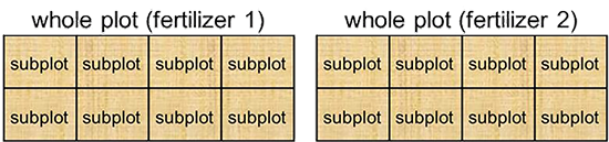 分割法の設計は、“whole-plot” と呼ばれる広い領域に1つの処理を適用し、“subplot” と呼ばれるwhole-plot内の小さな領域に他の処理を適用することで始まります。 例えば、whole-plotは肥料1(fertilizer 1)及び肥料2(fertilizer 2)について処理を行い、subplotは種子の種類1~8の処理を行う場合です(下図を参照)。