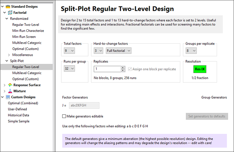 計画を再構築してデータを収集したので、このチュートリアルを続けて Design-Expert の持つ、分割法における2水準完全実施要因計画のための専用ツール、及びプロクラムの統計分析、診断を最終的に評価するための画面を表示します。