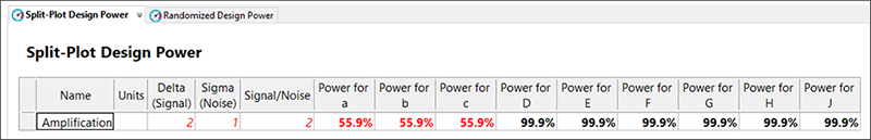 3) “Next” をクリックし、Response の入力画面を表示してSignal/Noise ratio をデフォルトのままもう一度 “Next” をクリックすることでSplit-Plot Design Power を表示することができます。HTC係数(a、b、c)の検出力が低下していることに注意してください。これは、HTC係数が8つのグループ(whole plot)に配置されているために発生し、無作為化が制限されます。