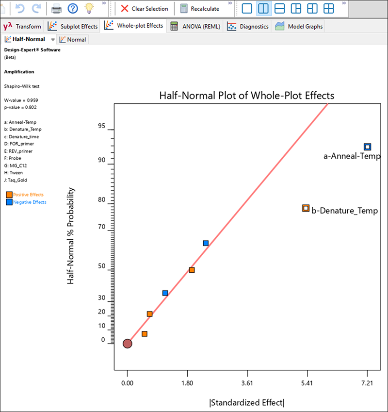 本分析は、subplot とwhole-plot の効果は別々に分析され、それぞれが独自の半正規プロットを取得するという1点を除いて、これまでのDesign-Expertの計画と同様に扱うことができます。Amplification の分析を開始するには、画面左の “Analysis” ブランチの下にある“R1-Amplification” ノードをクリックしてください。